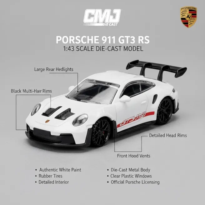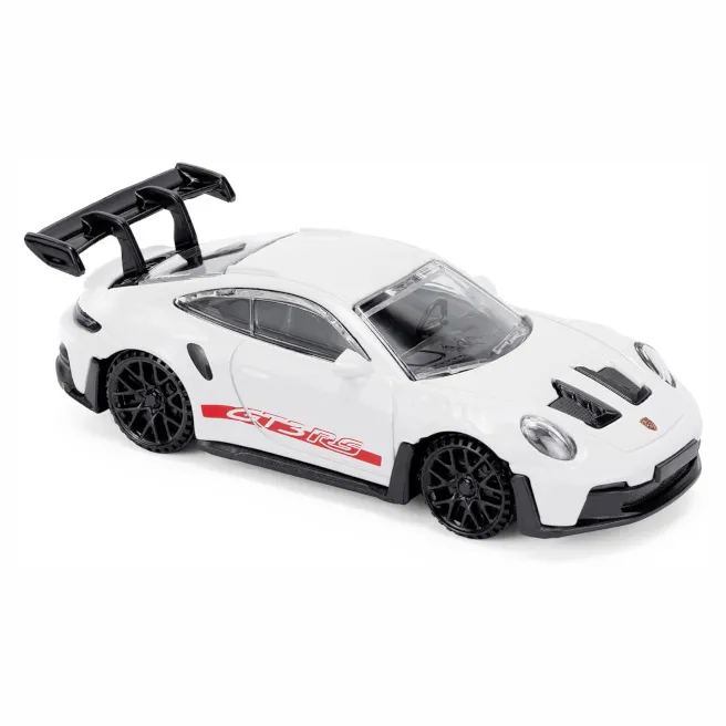 Mașina de jucărie Porsche 911 GT3 RS la scara 1:43 de la Rastar este o jucărie amuzantă la scara 1:43, prezentată într-o cutie colorată de carton cu fereastră, perfectă pentru micii pasionați de mașini. Datorită finisajului strălucitor, jocului simplu prin împingere și dimensiunii convenabile pentru mâinile mici, aceasta va fi o achiziție excelentă pentru banii de buzunar sau un mic cadou pentru copiii care iubesc mașinile.