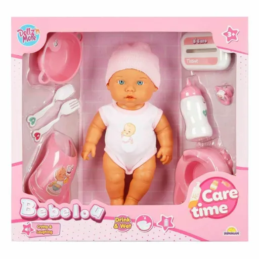 Ai burtica plină, dar ți-e sete? Îți aduc un biberon. Gata! Te simți mai bine acum, nu? Atunci hai să atașăm suzeta și e timpul să ne jucăm. Ai udat patul pentru că ai băut prea mult? Nicio problemă, olita este chiar aici, împreună cu setul de joacă Bebelou Sound Care Time Baby. Voi apăsa butonul de pe burtica ta care scoate sunete de râs și plâns ca să te facă să râzi și să te înveselești. Nu-ți face griji, eu voi avea grijă de tine!