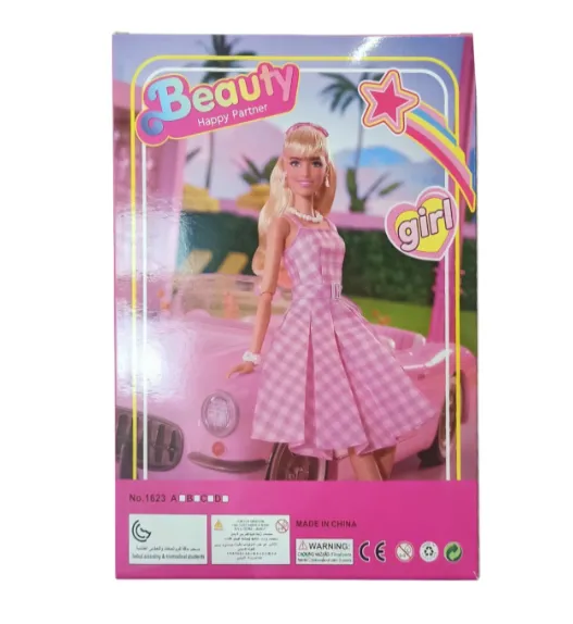 Blonda fermecătoare, înaltă de 29 cm (11,5 inci), este îmbrăcată într-un costum elegant roz din țesătură texturată cu imitație de tweed, format dintr-o jachetă scurtă și o fustă mini. Ținuta este completată de cizme elegante, înalte, de culoare roz, cu toc.
