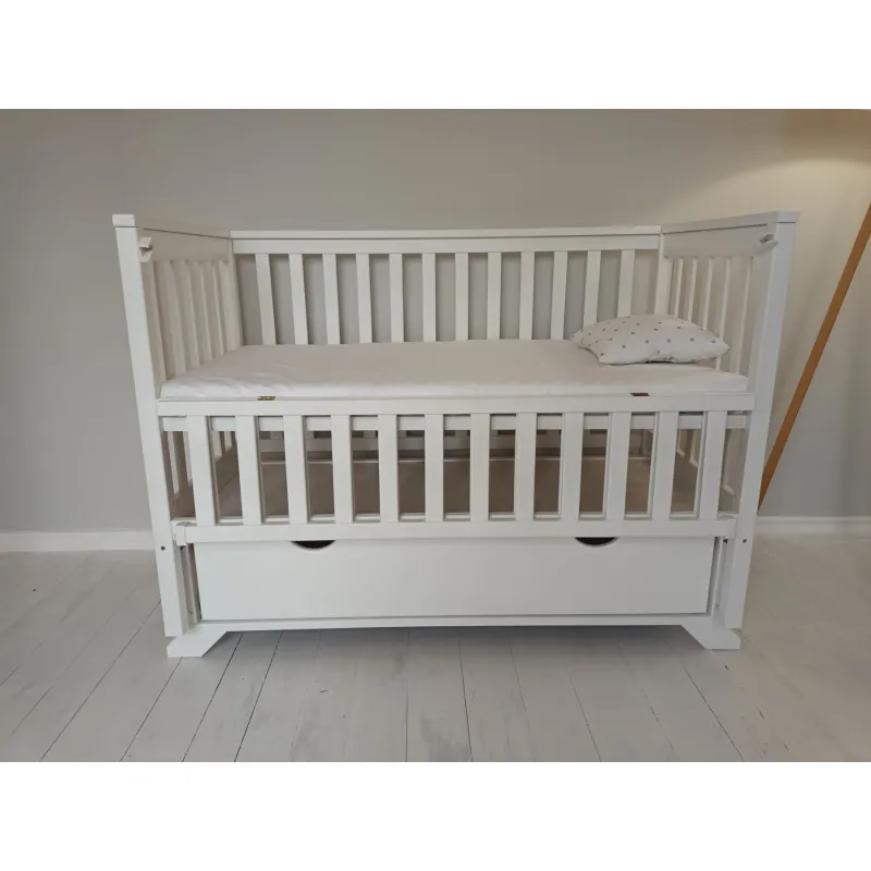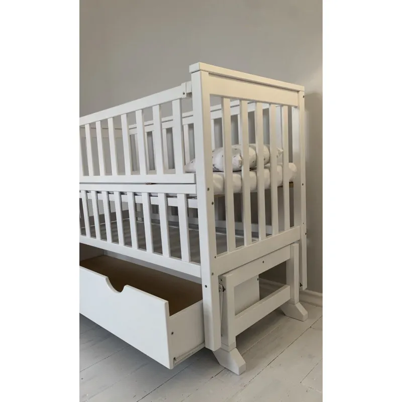 Кроватка имеет откидную боковину, бесшумный продольный маятниковый механизм на подшипниках с фиксатором;