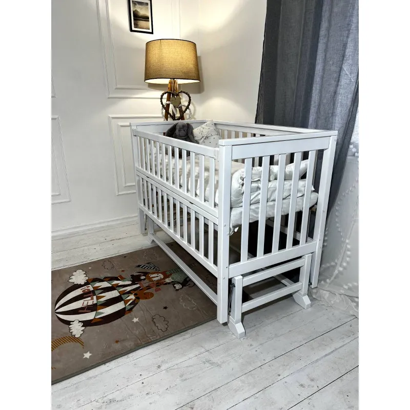 Patul are un perete lateral rabatabil, un mecanism de legănare (pendul longitudinal) silențios pe rulmenți;