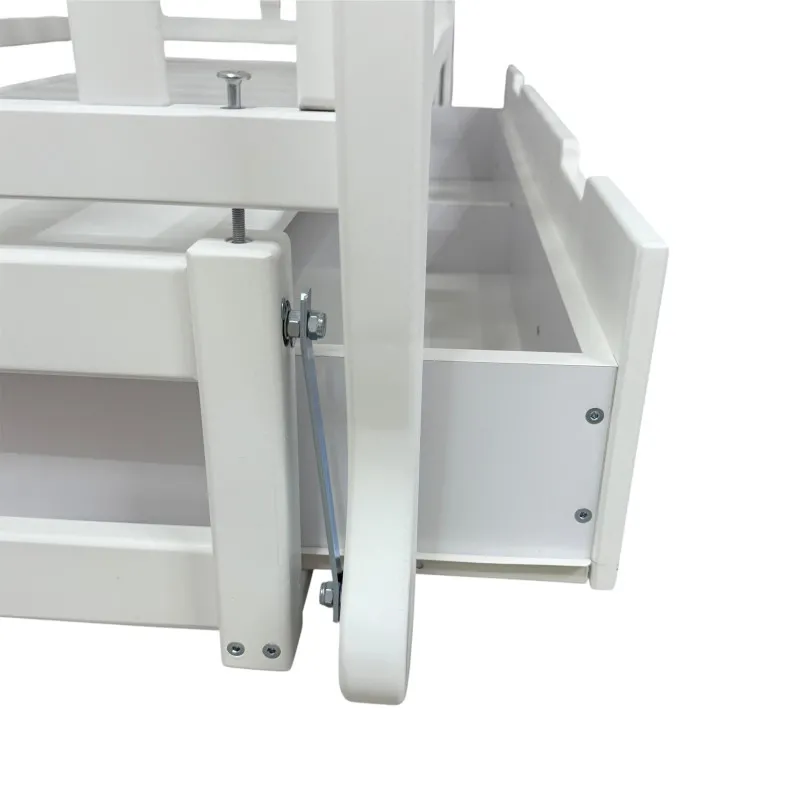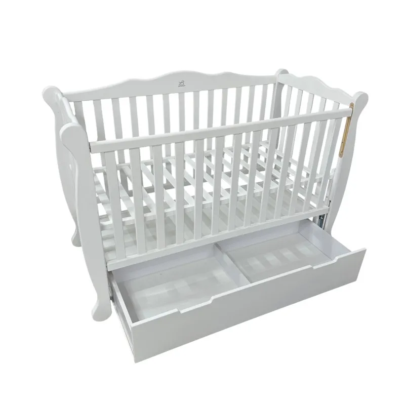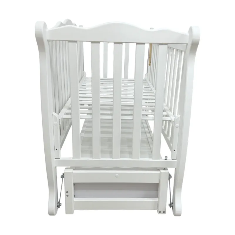 Mecanismul de legănare a patului este - pendul transversal. Prin urmare, cu ajutorul rulmenților metalici, părinții își pot adormi copilul în tăcere. Dacă este necesar, rulmenții pot fi fixați cu ușurință, iar patul va fi într-o poziție statică. Deasemenea patul este completat cu sertar închis pentru depozitarea lucrurilor.