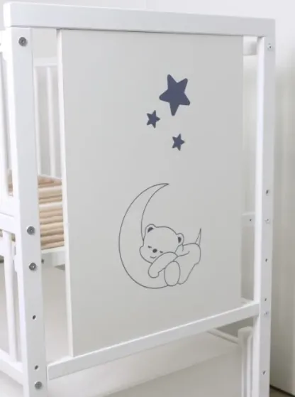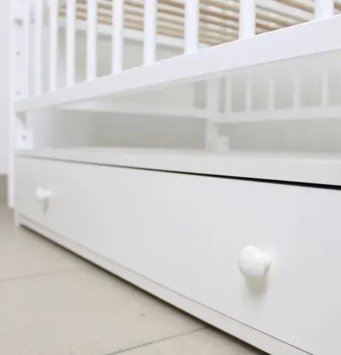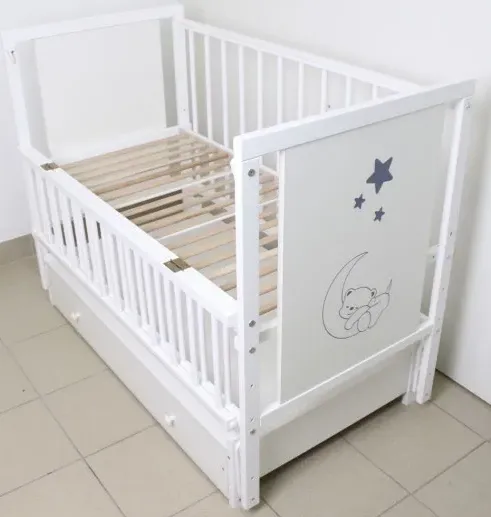 Patutul Kuzya este realizat din lemn si este considerat cel mai sigur si de cea mai buna calitate pentru bebelus. Patul este realizat din fag și vopsit cu lacuri și vopsele pe bază de apă, toate colțurile sunt rotunjite, deci este absolut sigur pentru un nou-născut. Pentru confortul bebelusului patucul este accesoriat cu un mecanism de balansare, de asemenea, patul este echipat cu un sertar pentru lenjerie și o laterală pliabilă.