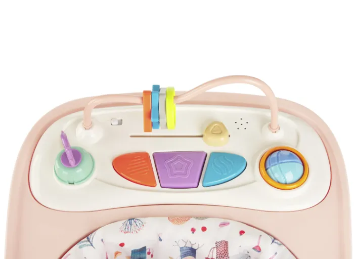 Distracție interactivă: Include panou muzical detașabil cu mecanisme de blocare și buton on/off, oferind momente plăcute de joacă și învățare.