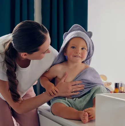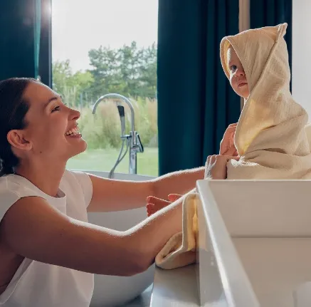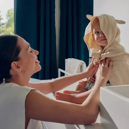 Pe lângă faptul că menține capul copilului cald după baie, gluga contribuie la formarea unor asociații pozitive cu timpul de baie.