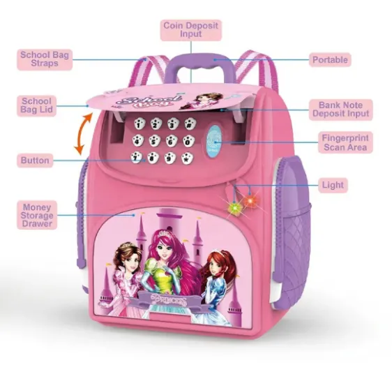 Acest ghiozdan adorabil nu este doar un accesoriu la modă, ci și un seif sigur pentru păstrarea banilor. Ghiozdanul este echipat cu o funcție de cod PIN, efecte de lumină și sunet, făcându-l unic și captivant pentru copil. Este un instrument excelent pentru primele lecții de educație financiară, învățând copilul despre gestionarea banilor și elementele de bază ale securității.