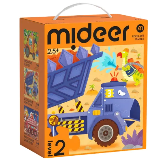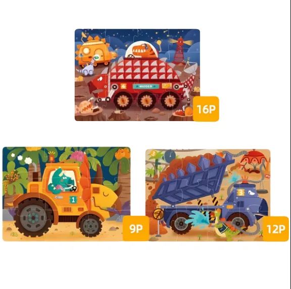Acest set de nivel 2 include 3 puzzle-uri cu dificultăți diferite (9, 12 și 16 piese), ilustrând dinozauri amuzanți care conduc vehicule de construcție și lucrează în păduri, pe câmpii, în peșteri sau chiar pe o altă planetă!