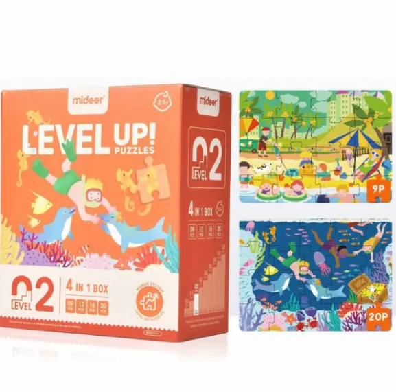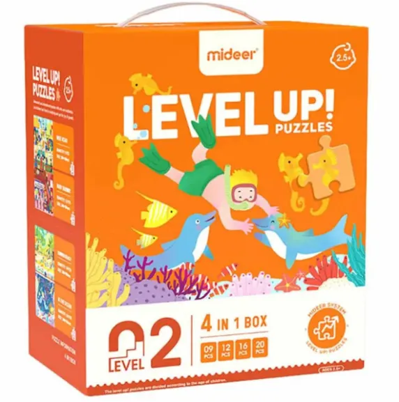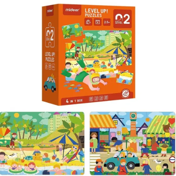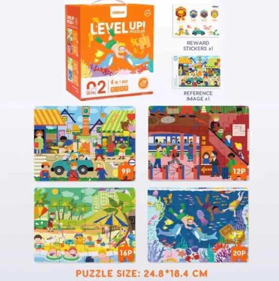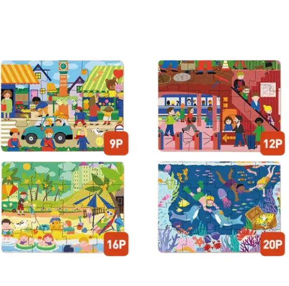 Setul conține puzzle-uri cu dificultăți progresive: 9, 12, 16 și 20 de piese, permițând copilului să avanseze treptat. Ilustrațiile pline de viață cu scene din viața de zi cu zi ajută copiii să înțeleagă mai bine lumea din jur, stimulând imaginația și concentrarea.