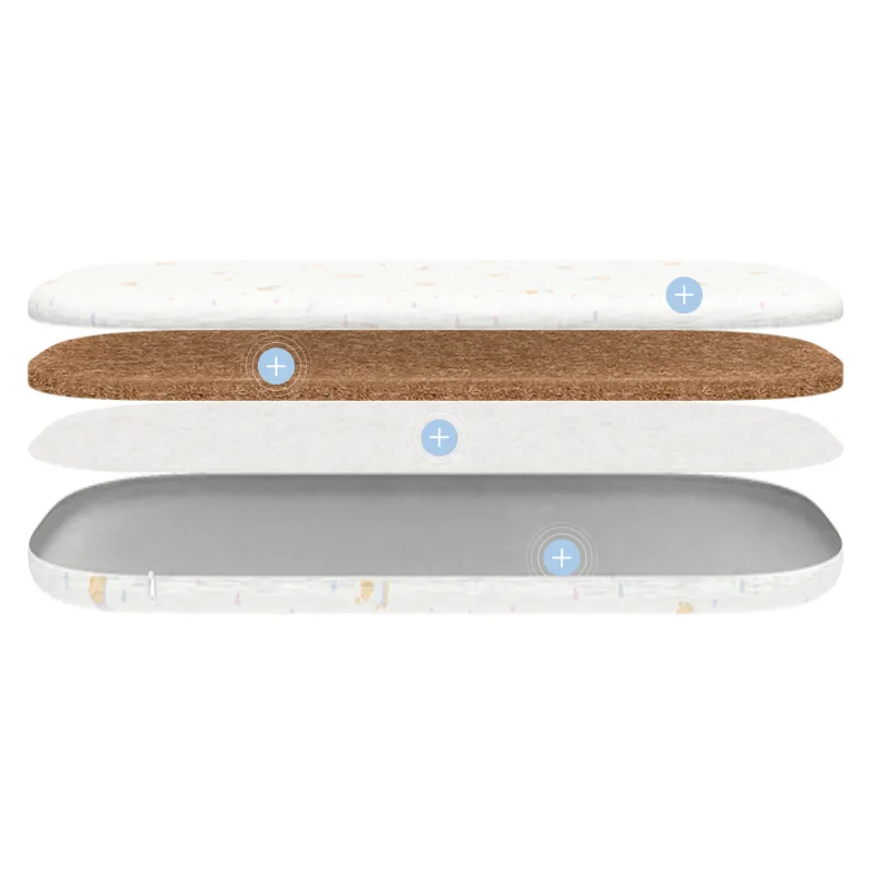 Saltea ortopedică fara arcuri, realizată din materiale hipoalergenice de calitate - nuca de cocos naturală, ce garantează suport sigur coloanei vertebrale si creaza un echilibru optim de temperatura pentru bebeluș și care deasemenea vă permite să aveți grijă de formarea viitoarei posturii a bebelușului încă din primele zile.