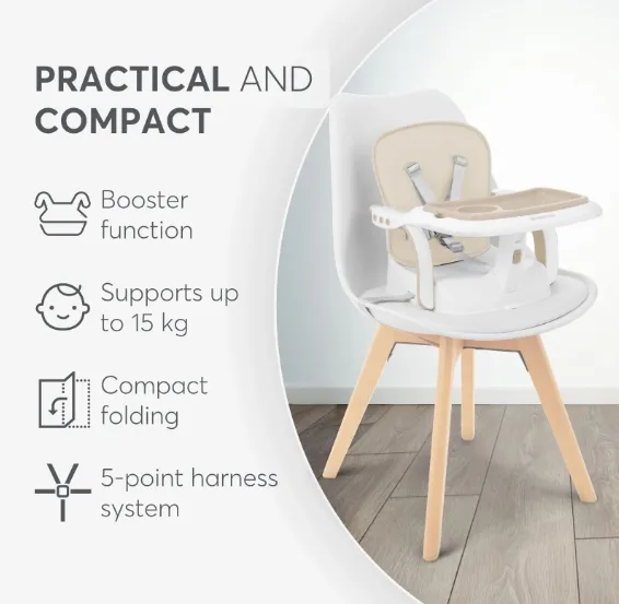 Designul versatil al lui CHEWY permite ridicarea copilului la înălțimea potrivită a mesei sau utilizarea ca scaun jos confortabil pentru hrănire, în funcție de nevoile copilului.