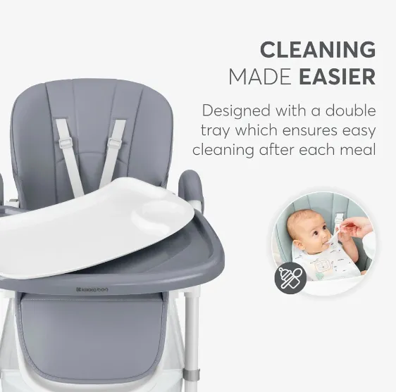 • Hrănire practică: tavă dublă detașabilă, cu suport pentru pahar și reglare în 3 poziții — flexibilitate și curățare ușoară.