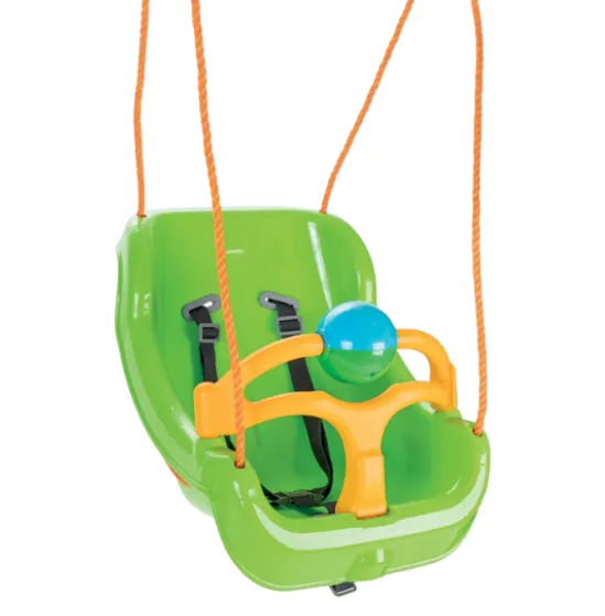 Șezutul leagănului se potrivește pentru copiii de la varsta de 1 an și dispune de suport pentru spate, dotat cu centuri de siguranță, iar in față o bară de protecție detașabilă în formă de T (cu zornăitoare). De asemenea, în set cu leagănul sunt incluse frânghii sintetice flexibile cu carabine.