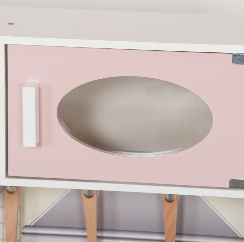 Funcții: imită aragazul, cuptorul, chiuveta și spațiile de lucru — ideală pentru jocuri de rol.