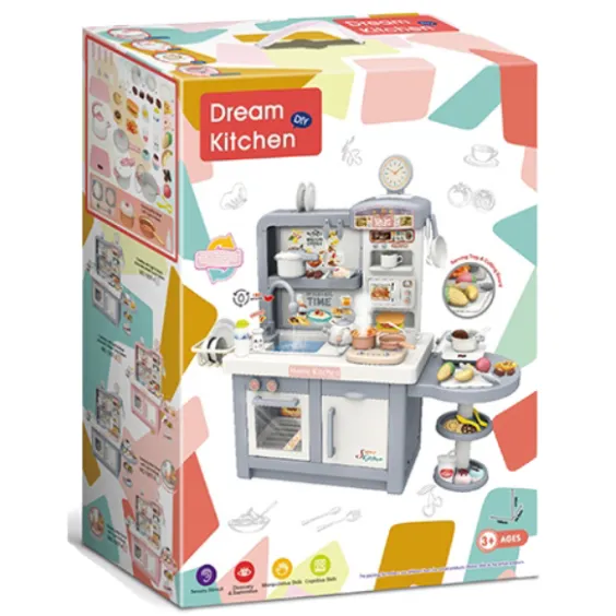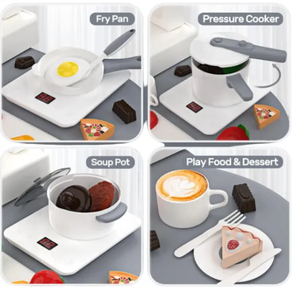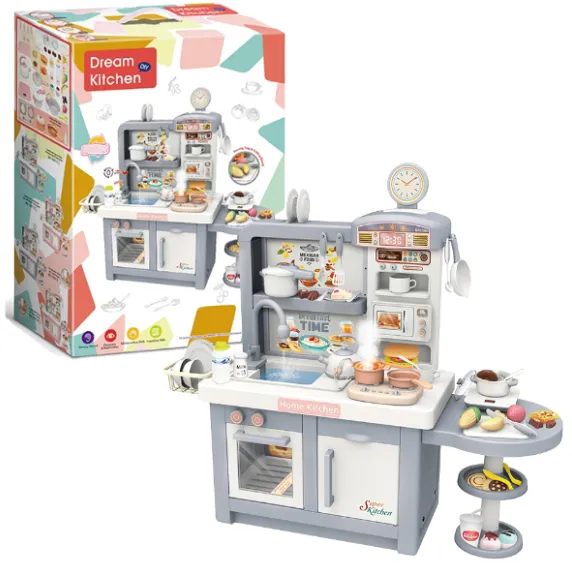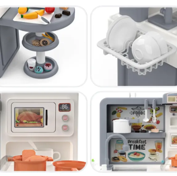 Setul de joacă „Bucătărie pentru copii” este un pachet complet pentru micii bucătari, care include 48 de accesorii, precum plită cu abur, chiuvetă de jucărie cu apă curgătoare, cuptor, cuptor cu microunde și multe ustensile de bucătărie. Acest set nu doar atrage copiii cu efecte sonore și luminoase, ci le oferă și oportunitatea de a-și dezvolta abilitățile prin joc.