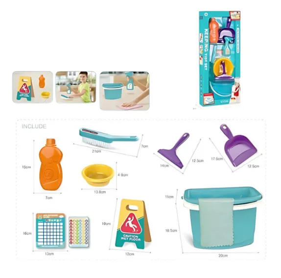Acest set de curățenie pentru copii cu găleată este un mod excelent de a-i învăța pe cei mici bazele menținerii curățeniei. Setul include diverse instrumente de curățenie, precum perie, făraș, racletă, lighean, sticlă pentru „detergent”, semn de avertizare „Atenție, podea udă” și o găleată practică cu cârpă. Toate piesele sunt fabricate din plastic durabil și sigur. Copiii se pot distra jucându-se de-a curățenia și, în același timp, învățând responsabilitatea pentru curățenia casei. Acest set dezvoltă motricitatea fină, coordonarea mișcărilor și imaginația. O jucărie ideală pentru copiii care adoră să ajute la treburile casnice.