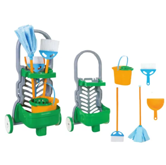 Setul de joacă „Cărucior de curățenie” este o modalitate distractivă prin care copiii pot învăța despre ordinea și curățenia în casă! Setul conține toate accesoriile necesare pentru curățenie: găleată cu sistem de stoarcere, mop, mătură, făraș și perie. Toate piesele pot fi depozitate ușor pe căruciorul cu roți, ușor de manevrat de către copil.