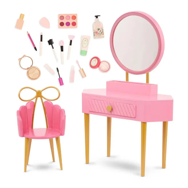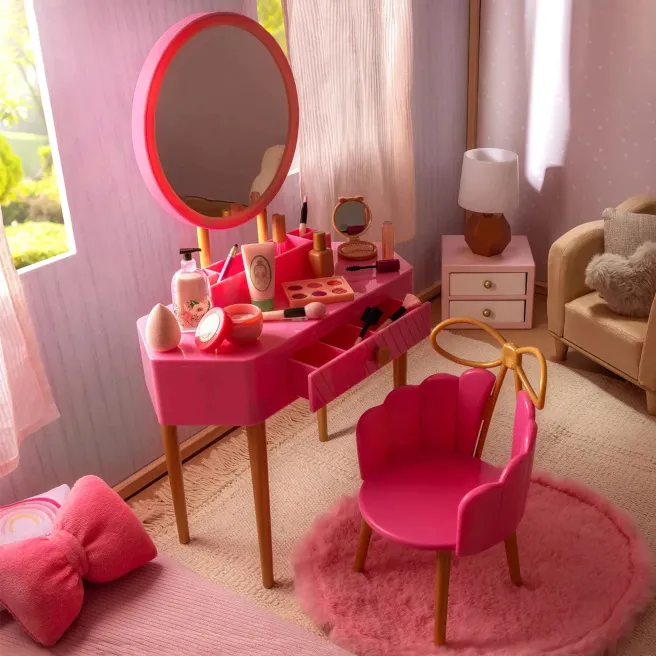 Această masă de toaletă pentru păpuși include o oglindă adevărată, compartimente de depozitare și o colecție vastă de accesorii cosmetice de jucărie, pentru a crea imagini unice și momente magice de joacă.