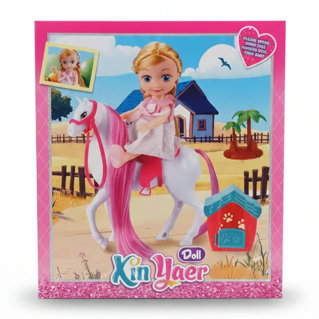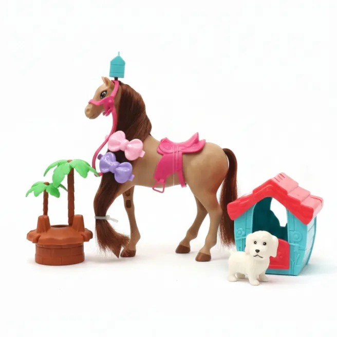 Setul se concentrează pe două figurine principale: un cal și un câine, și include diverse elemente pentru îngrijire și hrănire. Printre accesorii se află o castron pentru hrănire și o sticlă sau o găleată pentru adăpare, precum și un pieptene pentru îngrijirea coamei calului. Setul este fabricat din plastic sigur și durabil, în culori vii, și este ambalat într-o cutie transparentă, care permite vizualizarea întregului conținut.