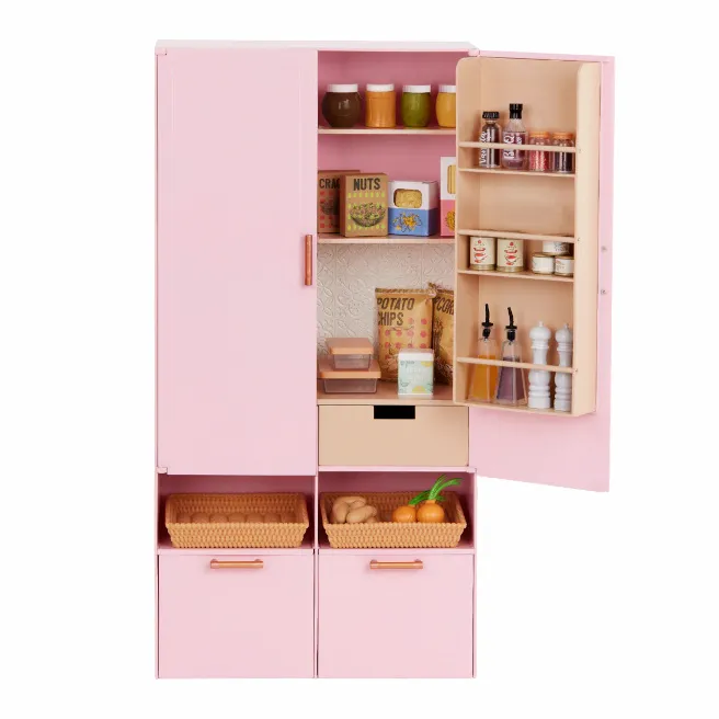 Copiii pot deschide ușile cămării și pot așeza pe rafturi peste 45 de produse de jucărie detaliate. În plus, cele 4 sertare glisante oferă și mai mult spațiu pentru depozitarea jucăriilor preferate! Cămară este realizată într-o gamă de culori roz strălucitoare și are un interior drăguț cu șorț, ceea ce o face un complement elegant pentru casele de păpuși sau seturile de bucătărie de acasă.