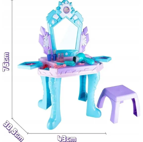 Setul conține tot ce este necesar pentru joaca de-a salonul de frumusețe: măsuță cu oglindă, scăunel și accesorii de machiaj.