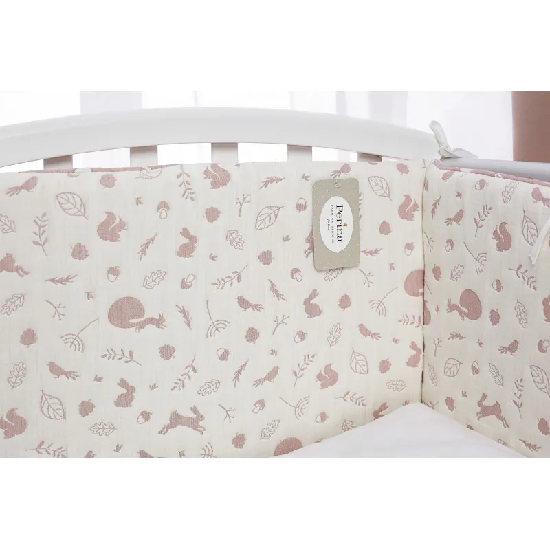 Setul elegant Perina Toys Pădure este potrivit pentru orice tip de interior, are nuanțe naturale și culori pastelate care oferă confort și rafinețe. Texturile diferite ale lenjeriei de pat și ale laturilor formează o combinație interesantă ce oferă libertate imaginației.