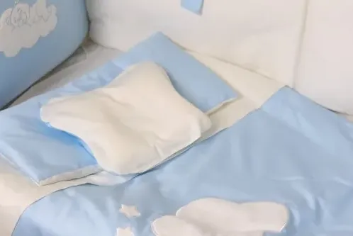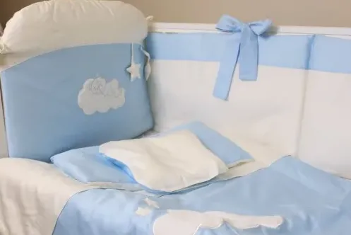Cearsaf de pat: 120x60 cm (1 buc.), Cearsaf de plapumă: 120x90 cm (1 buc.), Fată de pernă ortopedică: 30x25 cm (1 buc.), Fată de pernă pentru copil: 50x30 cm (1 buc.), Plapumă: 120x90 cm (1 buc.), Pernă ortopedică: 30x25 cm (1 buc.), Pernă pentru copil: 50x30 cm (1 buc.), Aparatori: 60x38 cm (6 buc.)