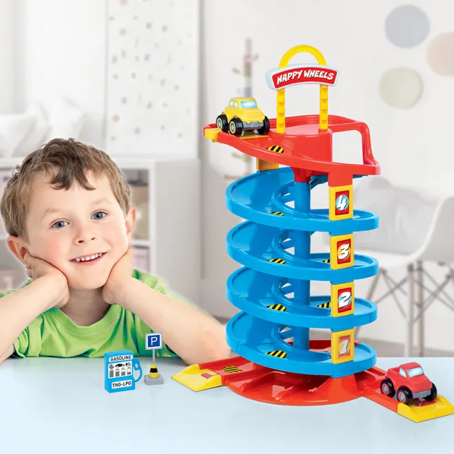 Copilului tău îi va plăcea cu siguranță această minunată jucărie. Pista multicoloră este ușor de asamblat și este o coborâre în spirală pentru mașinile incluse în set. Pentru ca copiii să extindă posibilitățile jocului, setul include indicatoare rutiere, un arc și o benzinărie.