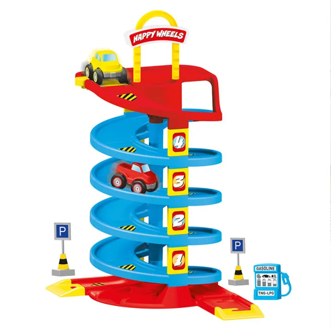 - Setul pentru jocul cu mașinile este reprezentat de piese de track care se asamblează cu ușurință într-un drum în formă de spirală și se țin strâns, menținând integritatea structurii.