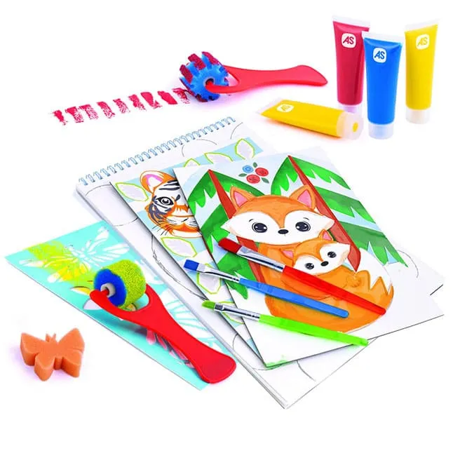 Include 6 pensule de diferite mărimi și forme, 12 vopsele acrilice în tuburi, 12 acuarele într-o cutie, caiet de schițe cu 15 foi de acuarelă, 5 creioane de desen, 1 pânză 27cm x 36cm, 2 pânze 27cm x 20cm, paletă, radieră, ascuțitor, rotiță de culori, instrucțiuni detaliate pentru diferite tehnici de pictură.