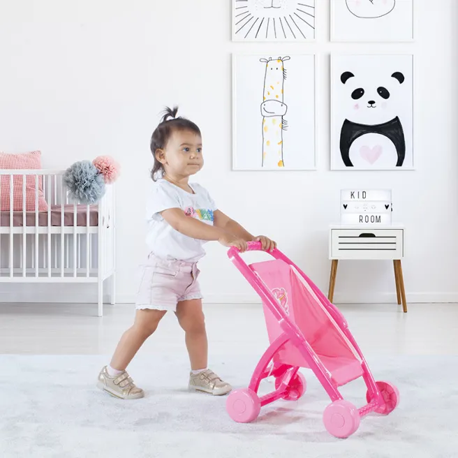 Cărucior pentru păpușile preferate ale bebelușului. Fabricat în culoare roz aprins cu imprimare unicorn, căruciorul se pliază și datorită mecanismului său durabil merge cu ușurință. Această jucărie este concepută pentru a vă învăța să aveți grijă și să dezvoltați imaginația.