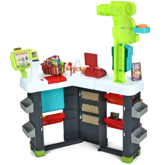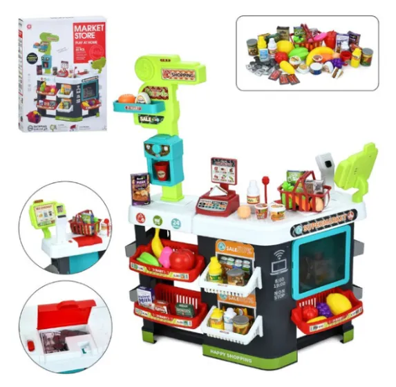 Setul de joacă pentru copii „Magazin cu rafturi” este o jucărie realistă pentru copii care iubesc jocurile de rol. Setul include un raft mare de 87 cm înălțime, cu polițe, casă de marcat și scaner care emite semnale luminoase și sonore în timpul „cumpărăturilor”. Setul conține în total 81 de piese: produse din plastic, ambalaje, bani, coș și accesorii. Există un compartiment separat pentru frigider și casa de marcat cu sertar pentru bancnote. Datorită numărului mare de elemente, copilul poate aranja propriul magazin, poate juca cu prietenii sau cu părinții, dezvoltând logica, vorbirea, imaginația și motricitatea fină.