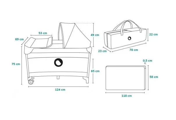 Kit: patut, saltea, copertina, plasa de tantari, masa de infasat, arc cu jucarii, geanta de transport, manual de instructiuni.