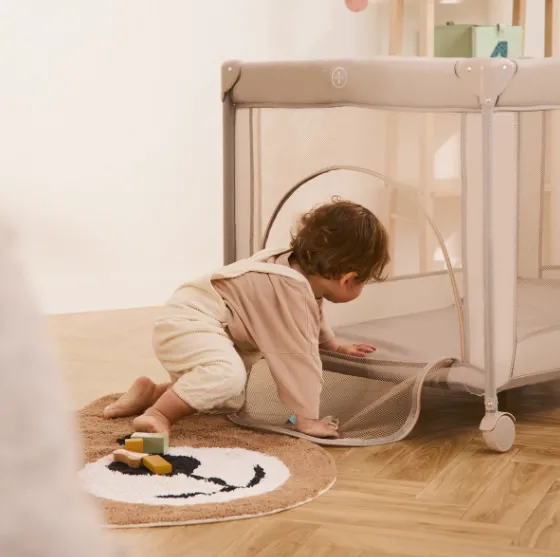 Fermoar lateral permite acces independent și transformă pătuțul într-un spațiu de joacă