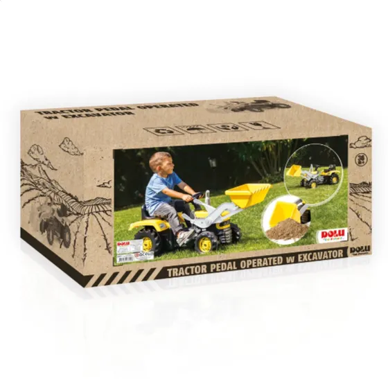 Tractorul încărcător cu pedale este un vehicul mare pentru copii, conceput pentru joacă activă și explorare. Designul realist, cu cupă frontală mobilă, permite copiilor să transporte nisip, pământ sau jucării, stimulând imaginația și jocul de rol.