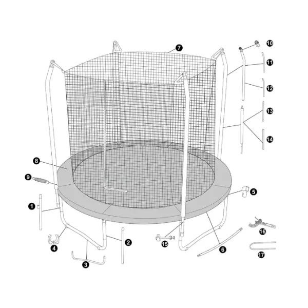 Conținutul pachetului: 1 trambulină, 1 unealtă pentru montarea arcurilor, 4 ancore, 8 tampoane pentru picioare.