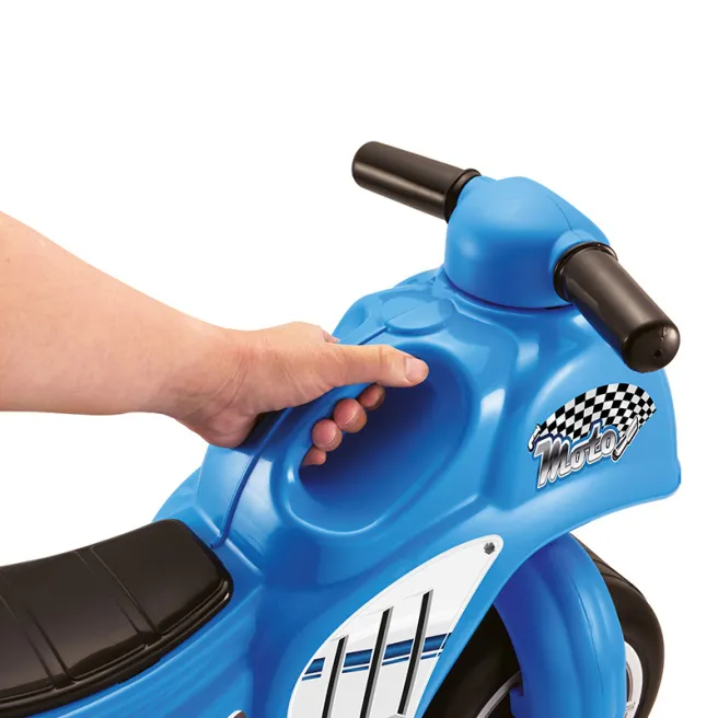Motocicleta este decorată cu autocolante în stil sport în albastru și este fabricată din plastic rezistent la impact și rezistent la decolorare. Această jucărie este destinată copiilor cu vârsta de peste 2 ani, este fabricată sub forma unei motociclete albastre.