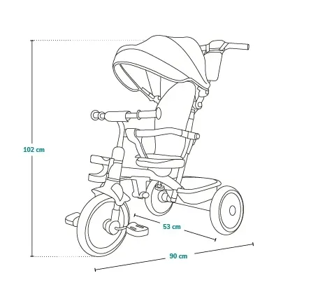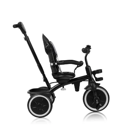 Mânerul ajustabil, care poate fi reglat între 82 și 100 cm, se adaptează la înălțimea îngrijitorului, asigurând o utilizare confortabilă. Sistemul de direcție din mâner permite părinților să controleze complet direcția tricicletei, în timp ce frânele separate pe roțile din spate permit blocarea vehiculului atunci când este staționar.