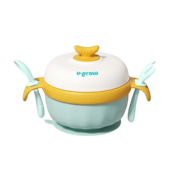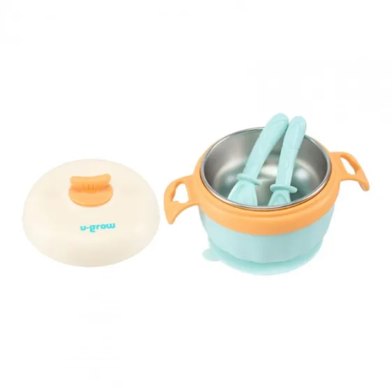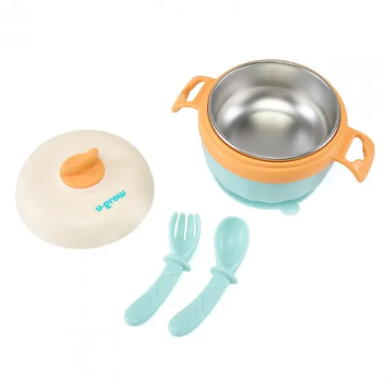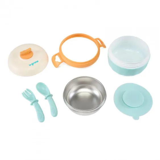 Pentru menținerea temperaturii, în compartimentul exterior din polipropilenă se adaugă apă fierbinte sau rece. Bolul interior este fabricat din inox. În pachet sunt incluse și o linguriță și o furculiță pentru copii.