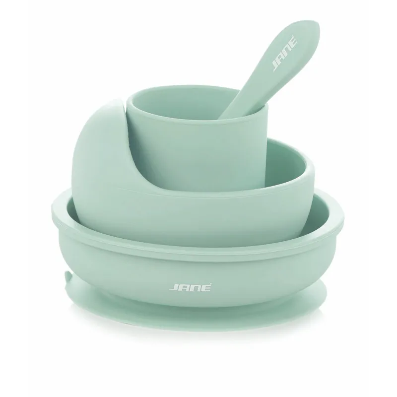 Setul de masă din silicon Jane pentru copii este confecționat din silicon și include un bol, o farfurie plată, o lingură și un pahar. Este practic și compatibil cu sterilizatoarele. Farfuria și bolul au ventuze la baza lor pentru o mai mare siguranță și comoditate. Bolul are un margini înalte pentru a ușura administrarea alimentelor lichide și semisolide.