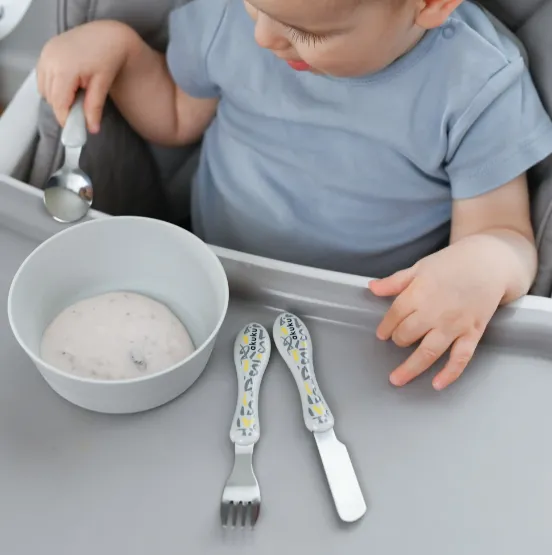 Un set practic și confortabil, ideal pentru învățarea hrănirii independente. Forma tacâmurilor este adaptată mâinilor mici ale copilului. Fabricate din oțel inoxidabil de înaltă calitate și materiale sigure pentru contactul cu alimentele. Nu conțin bisfenol A (0% BPA).